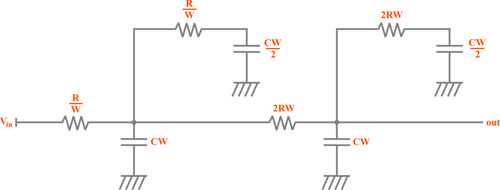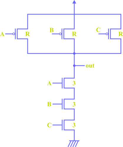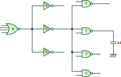 اگر نسبت اندازه ترانزیستورها در معکوس کننده واحد برابر با دو به یک باشد، مقدار بهینه تأخیر تلاش منطقی هر مرحله در مدار زیر به کدام مورد نزدیک است؟