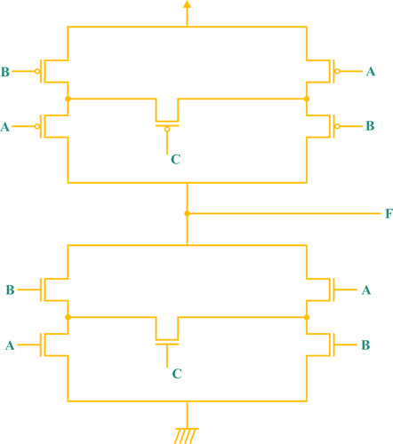 در مدار زیر چنانچه ورودیهای A و C بتوانید به جای یکدیگر سوئیچ زده شوند، ممکن است به اشتباه مقادیر درستی را در خروجی داشته باشیم و به همین دلیل نتوانیم خطائی را شناسایی کنیم. کدام بردارهای آزمون (در هر دو بخش nMOS و pMOS) قادر به شناسایی چنین خطایی است؟